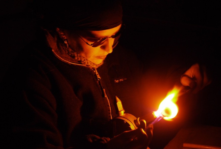 Je travaille le verre à la flamme d'un chalumeau. On peut le trouver sous différentes formes, c'est-à-dire qu'il peut être en baguette quand on veut le travailler plein et quand on veut travailler le verre soufflé on va partir d'un tube de verre.