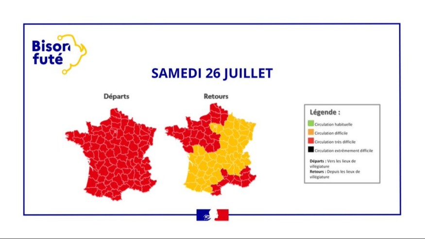 Ce week-end sera marqué par une circulation très difficile pour les journées de vendredi et samedi. Effectivement, la journée de vendredi comme celle de samedi est classée rouge dans le sens des départs (et aussi Rouge vendredi dans le sens des retours sur l’Arc méditerranéen). Cela s'annonce aussi difficile samedi dans le sens des retours dans le Grand Ouest, le Nord et l’Arc méditerranéen classé rouge.